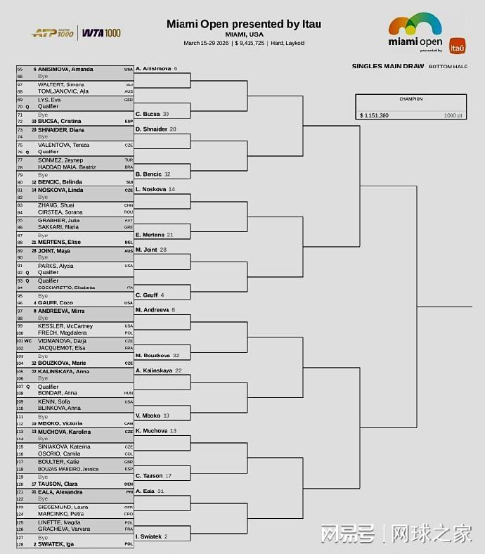 而WTA1000迈阿密站的单打签表已经出炉,前八大种子的对位:上半区,萨巴伦卡--鲍里妮、莱巴金娜--佩古拉;下半区,阿尼西莫娃--高芙、米拉-安德列娃--斯瓦泰克。上届八强、中国一姐郑钦文位列第23号种子,首轮轮空,次轮将对阵美国人布雷迪或斯蒂芬斯,第三轮的潜在对手是美国名将凯斯或刚刚赢过她的克罗地亚人鲁季奇,第四轮将对位世界第一萨巴伦卡,签表很硬,保分压力很大。